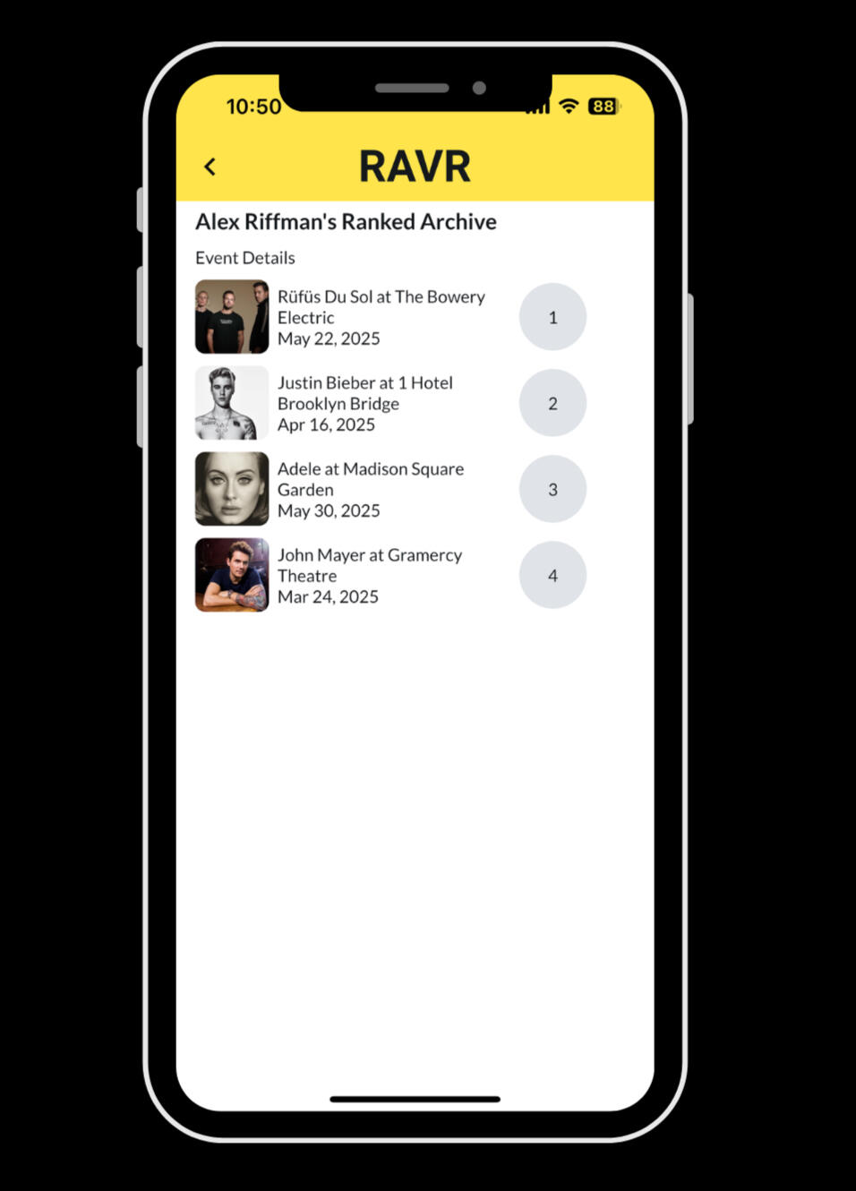 RAVR is an app for all concert goers and your brand new rave buddy. Review, rank, and archive every show you attend then share it all with your community.
