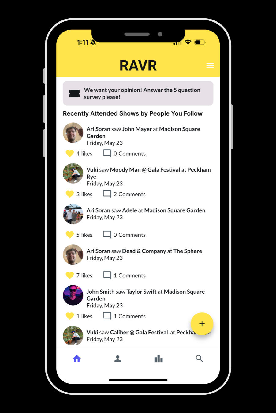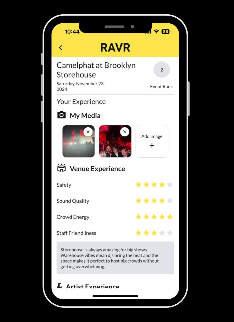RAVR is an app for all concert goers and your brand new rave buddy. Review, rank, and archive every show you attend then share it all with your community.